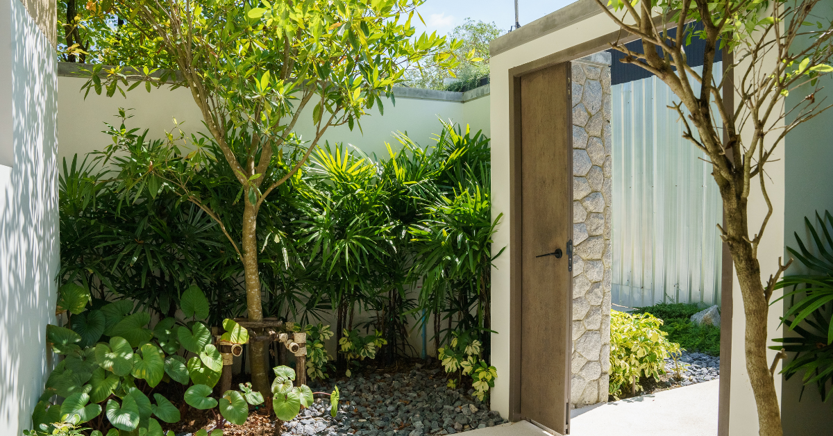 - 私人泳池区装饰着绿色花园,增添清新感和私密性